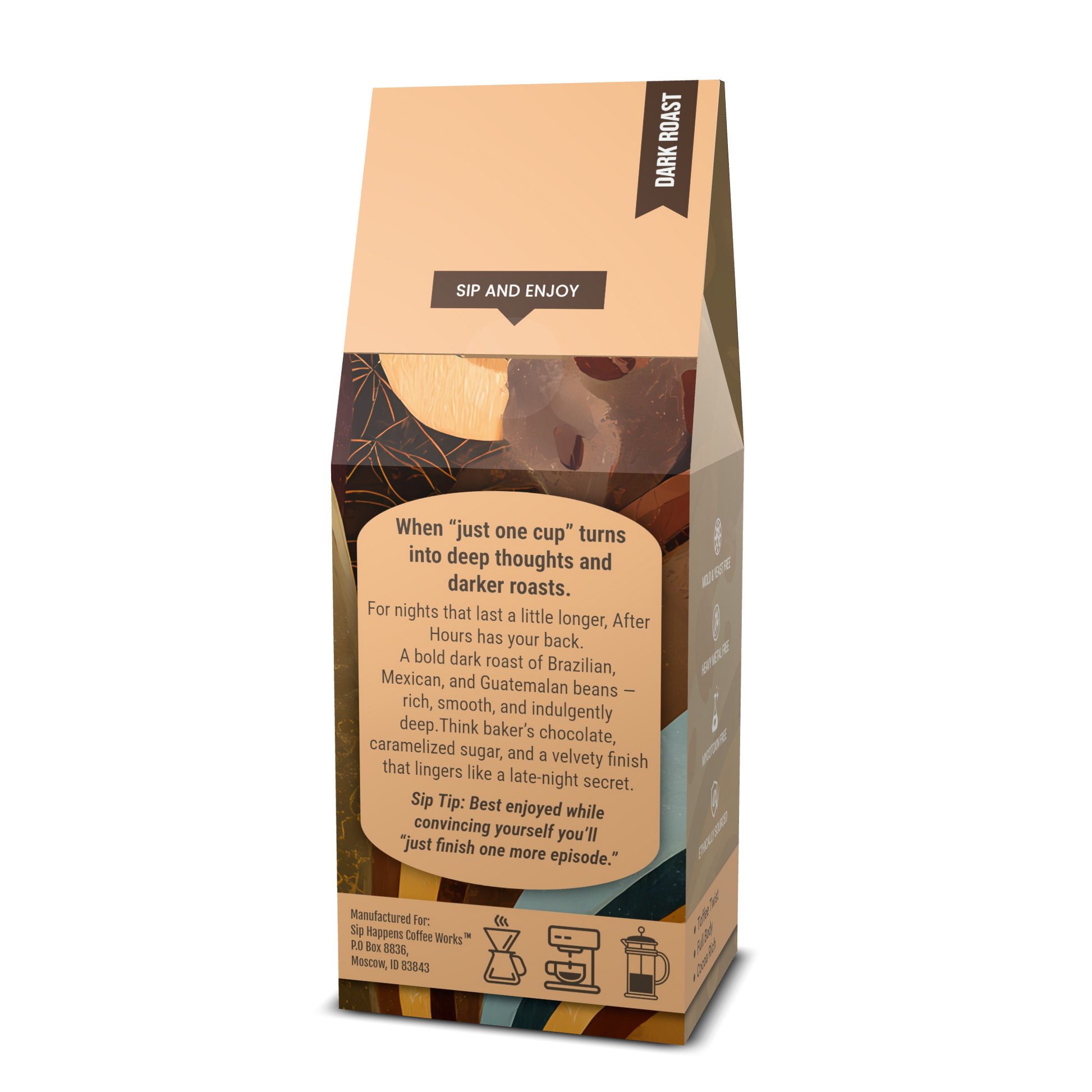 For nights that last a little longer, After Hours has your back. This bold dark roast blends Brazilian, Mexican, and Guatemalan beans into a cup that’s rich, smooth, and indulgently deep. Think baker’s chocolate, caramelized sugar, and a velvety body that lingers like good conversation past midnight. Balanced, bold, and unapologetically satisfying.